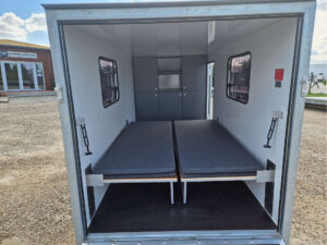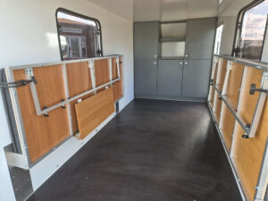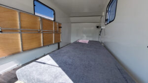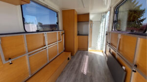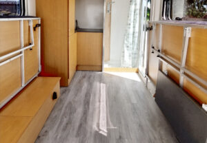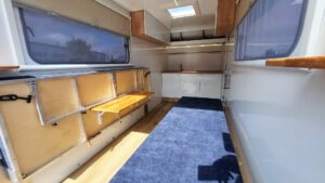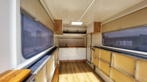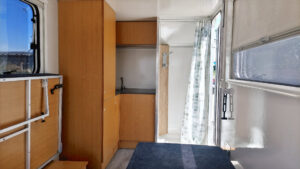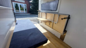 - Kalustepaketti 1 (kokoontaitettava pöytä, lattiapäällyste, mukava sänky isolla säilytystilalla, patjat, kaapit vaunun etuosassa)