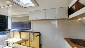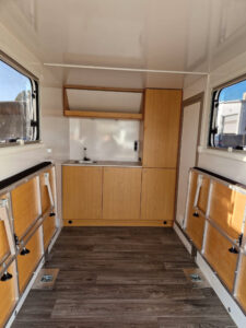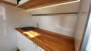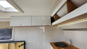- Säilytysjärjestelmä – keittiön kaapit vaunun etuosassa